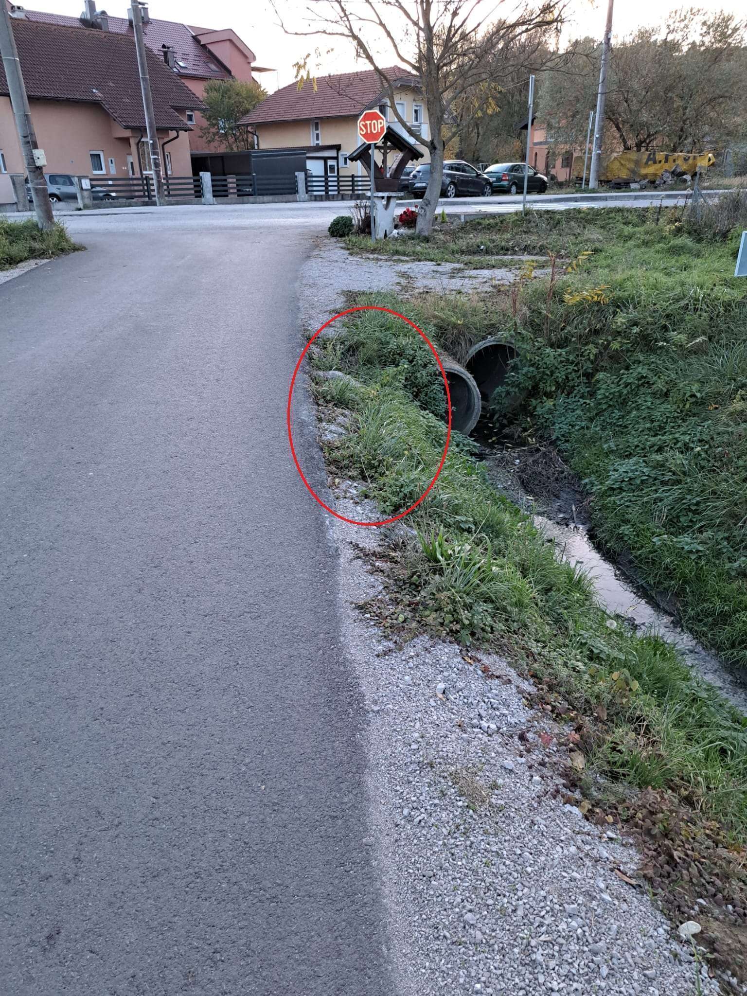 Tijekom kiše voda se slijeva s višeg dijela ceste i ispire šljunčani temelj uz rub kolnika prema Ratkajevom potoku. Zbog toga se vec ispire temelj ispod ruba asfalta. Ako se to ne sanira na trajniji način, postoji opasnost da se rub ceste uruši.