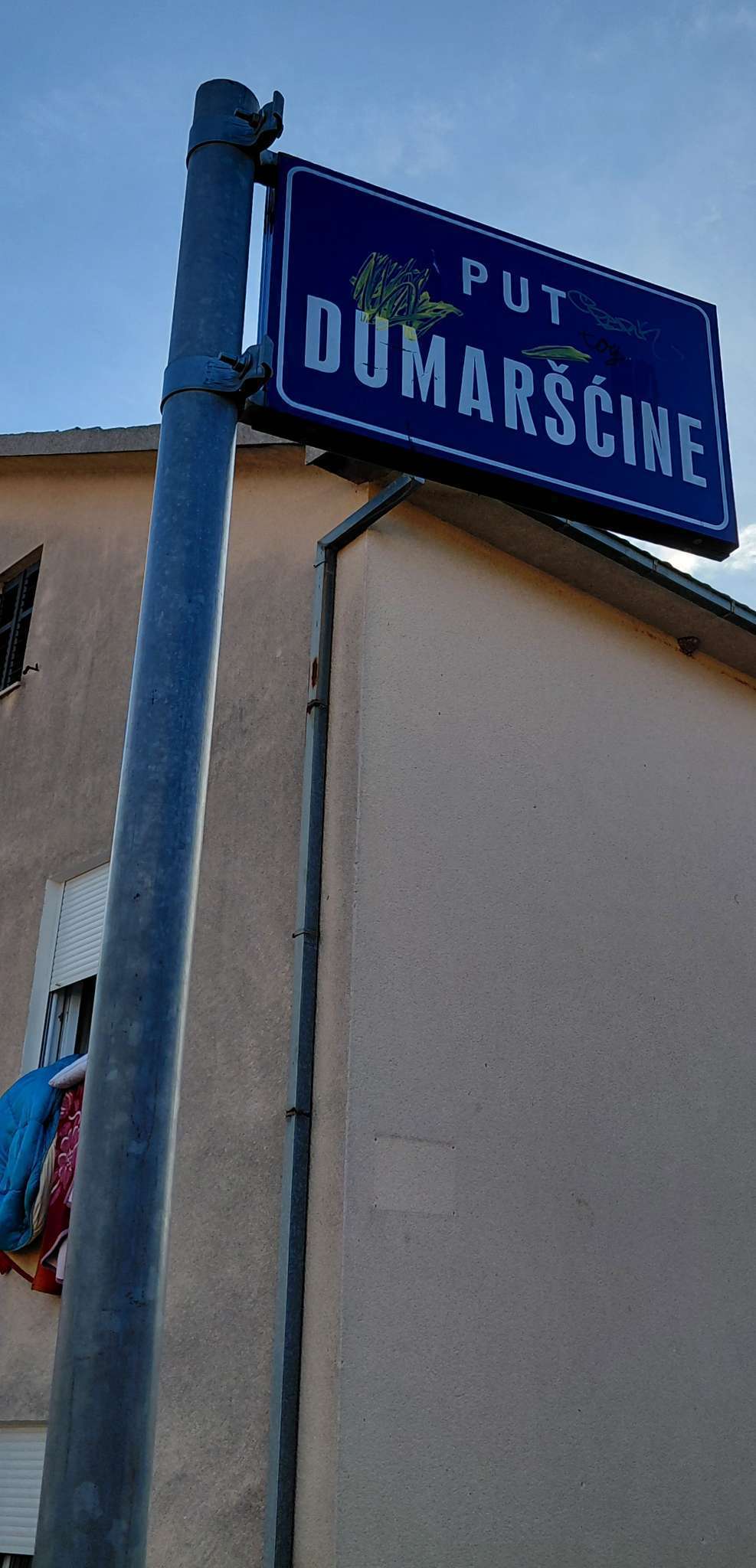 Znak je vandaliziran te tako stoji mjesecima! Natpis je pogotovo nečitljiv kad se gleda s južne strane!